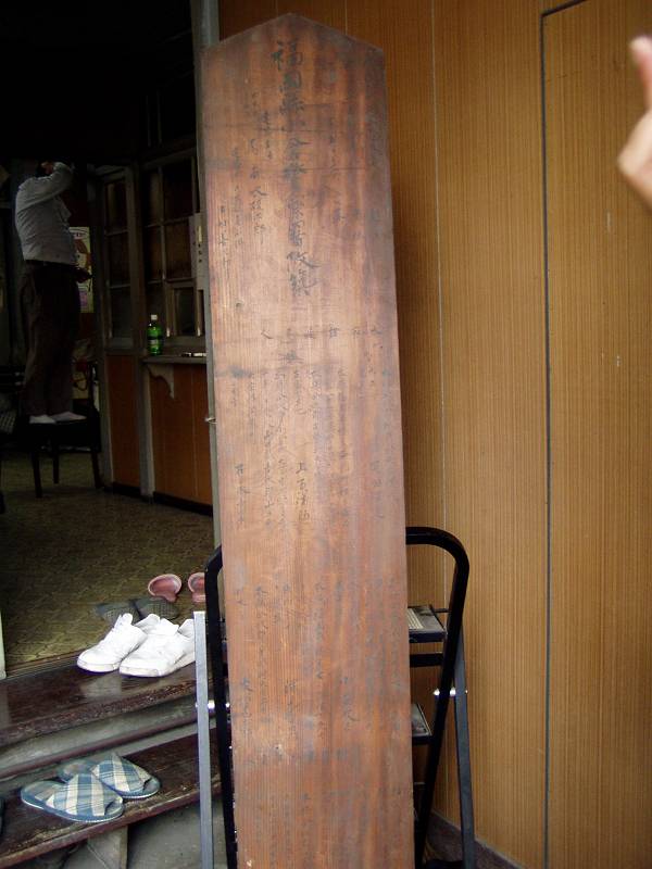 建設業者でもある会員のひとりに「これなんでしょうね」、と尋ねると「と渡り板じゃないの」との返事。それでもどうしても気になり裏面を覗いたところ、なんと、小倉警察署改築~、と書いてあるではないですか!
