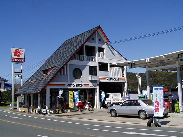 で、この建築。設計は村野藤吾、出光興産の社主出光佐三の肝いりでこのような地方都市(とすら言えない集落)に建てられた、とても気合いの入ったスタンドです。竣工は1972年。72年、、、無理です。さすがにここまで入れてしまうと、近代化とか何とか言う言葉時代が嘘くさくなります。建物の質やまちなみに関する考え方自体が既に変質してしまっている時代を入れることには、さすがに抵抗があるんです。